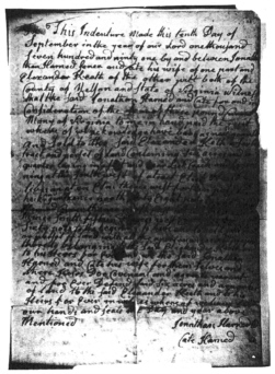 - - - - - 5. Children of Nathaniel Harned - - - - 4. John Harned - b: ca. 1724 at Woodbridge, Middlesex Co, NJ. Family tradition says that John disowned his sons Jonathan and Reuben who espoused the Patriot cause. A list of loyalists from Middlesex Co. NJ whose estates were liable to confiscation, included John and Nathaniel Harned. On 15 Aug 1778 they were both subjected to an inquisition for aiding the British against the State of New Jersey. A 12 Feb 1779 reference indicates that Nathaniel's property had been confiscated, and John's property at Woodbridge was confiscated at about the same time. There is no further record of John, but it is likely that John moved to New York following this confiscation, because all of his children settled in New York City and Suffolk Co, Long Island. - - - - - 5. Children of John Harned - - - - 4. Nathan Harned - b: ca. 1731/2 at Woodbridge, Middlesex Co, NJ; d: 17 Nov 1778 at Woodbridge; m: 1 May 1760, Elizabeth Van Court , b: 20 Dec 1735 prob. at Raritan, Somerset Co, NJ, d: 24 Nov 1807 at Woodbridge, dau. of Elias and Ann (Cooper) Van Court of Piscataway, Middlesex Co, NJ. He and son David left the Quaker faith and became Methodists. Nathan and Elizabeth were buried at the Quaker Burial Yard (now the Methodist Episcopal Cemetery). - - - - - 5. Children of Nathan Harned - - - - 4. Elijah Harned - b: ca. 1734 at Woodbridge, Middlesex Co, NJ. He probably shows in the 1790 census as Elijah Hornett at Mifflin Co, PA. - - - - - 5. Children of Elijah Harned - - - - 4. Daniel Harned - b: ca. 1737 at Woodbridge, Middlesex Co, NJ. He may be the Daniel Harnet who on 24 Jun 1756 was accused at Perth Amboy, Middlesex Co, NJ of attempting to murder a family of friendly indians. He may also show as Daniel Harnet of Prince William Co, VA who signed a petition with many other baptists on 11 May 1776. - - - - 4. Samuel Harned - b: ca. 1740 at Woodbridge, Middlesex Co, NJ. He lived at New Jersey. - - - - - 5. Children of Samuel Harned - - - - 4. Josiah Harned - b: 1743 at Woodbridge, Middlesex Co, NJ; d: 1797 at VA; m: 24 Jan 1768 at Philadelphia, Philadelphia Co, PA, Jane Harmer. Family tradition says he served as a spy under Gen. Greene in the Revolution. He shows as living in Middlesex Co, NJ during 1778-1781. He later removed to Loudoun Co, VA, where he lived for the rest of his life. - - - - - 5. Children of Josiah Harned - - - 3. Mary Harned - b: ca. 1693; m: 4 Mar 1716 at Jamaica, Suffolk Co, NY, Thomas Hooper. The NJ Calendar of Wills shows on 21 May 1712 one Mary Hornet of Queens, NY indebted to estate of Mary Oakley of Monmouth Co, NJ, Mary's will dated 1 Jan 1711/12, was probated 1 Apr 1712. - - - 3. Edward Harned - b: 1700, Huntington, Suffolk Co. NY; d: 1774; m: Rebecca -----, b: 1704, d: 1775. Edward was included in a list of townsmen to whom, on 1 Aug 1730, Arthur Tappan sold four and one half acres at Bonham Town for benefit and use of a school. About 1735 he moved to Hunterdon Co. NJ to the West Jersey Society's Great Tract, probably near Locktown. He is shown as occupying 200 acres. The list also includes the names of Jabis, Peter and Christian Jarvis, most certainly descendents of the Jarvis family which accompanied Edward Harnett, Jr. [1] and the Chichesters from Salem to Huntington, Long Island in 1658.